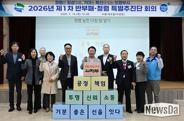 뉴스다 최광묵 기자 | 의정부시는 3월 19일 시청 태조홀에서 시장을 비롯해 부시장, 국·소 및 권역국장, 부서장 등 간부 공무원 87명이 참석한 가운데 ‘반부패·청렴 특별추진단 회의’를 열고 ‘기분 좋은 선’ 청렴 실천 공동 선언과 함께 2026년 반부패·청렴도 향상 종합 추진계획을 공유했다.