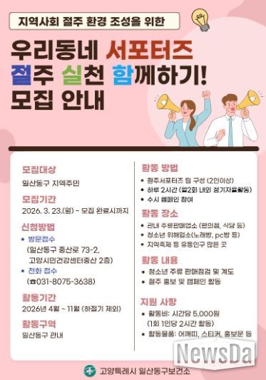 뉴스다 최광묵 기자 | 고양특례시 일산동구보건소는 건전한 음주문화 확산과 절주 실천 분위기 조성을 위한 ‘우리동네 서포터즈’의 참가자를 오는 3월 23일부터 모집한다.