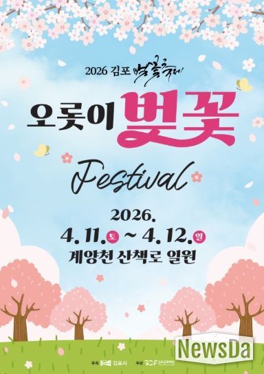뉴스다 최광묵 기자 | 김포시가 오는 4월 11일부터 12일까지 이틀간 김포 대표 벚꽃 명소인 계양천 산책로 일원에서 ‘2026 김포 벚꽃축제’를 개최한다.