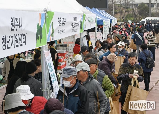 원주시와 북부지방산림청이 주최하고 산림조합과 원주시 조경협회가 후원하는 이번 행사는, 탄소흡수원으로서 미세먼지 저감과 기후변화 대응에 중요한 역할을 하는 나무를 시민들에게 나눠 주며 나무심기 문화를 확산하기 위해 마련됐다.