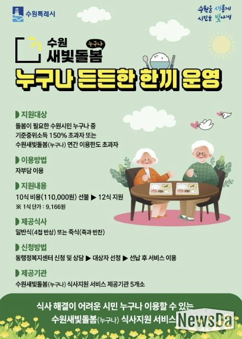 뉴스다 최광묵 기자 | 수원특례시가 자부담으로 수원새빛돌봄(누구나) 식사지원 서비스를 이용하는 시민에게 추가 식사를 제공하는 ‘누구나 든든한 한끼’ 사업을 운영한다.