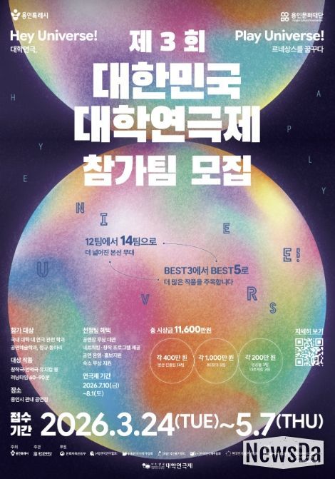 뉴스다 최광묵 기자 | 용인특례시가 주최하고 용인문화재단이 주관하는 '제3회 대한민국 대학연극제'가 오는 3월 24일부터 5월 7일까지 전국 대학을 대상으로 참가팀을 모집한다.