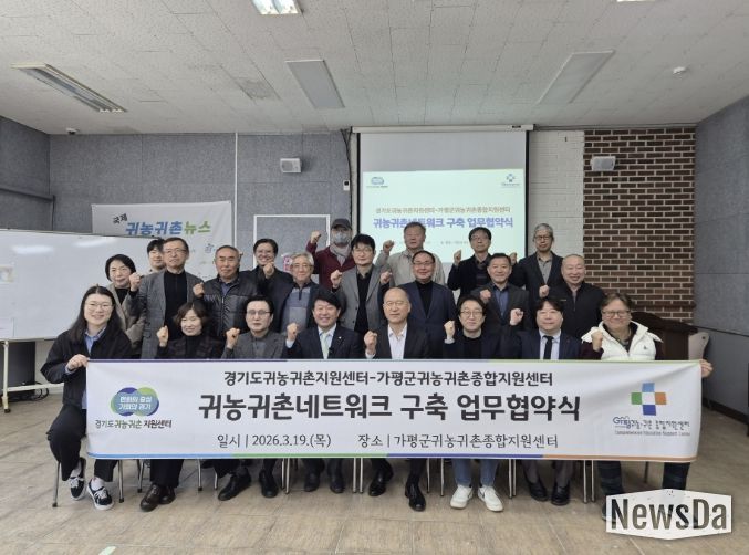 뉴스다 최광묵 기자 | 가평군귀농귀촌종합지원센터와 경기도귀농귀촌지원센터는 19일 가평 교육장에서 귀농귀촌 네트워크 구축을 위한 업무협약(MOU)을 체결했다. 이번 협약은 귀농귀촌 희망자의 안정적인 농촌 정착을 지원하고 경기도 농어촌의 지속 가능한 발전을 도모하기 위해 마련됐다.
