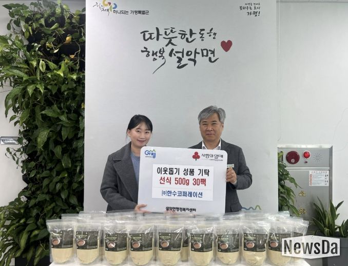 뉴스다 최광묵 기자 | ㈜한수코퍼레이션은 최근 가평군 설악면 행정복지센터를 방문해 관내 취약계층을 위해 선식 500g들이 30팩을 기탁했다.