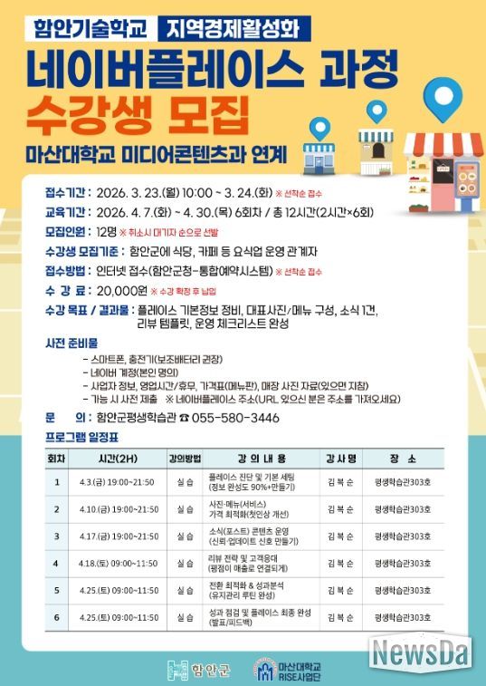뉴스다 최광묵 기자 | 함안군은 지역 내 요식업 종사자의 온라인 홍보 역량을 강화하기 위해 ‘네이버플레이스 운영 과정’ 수강생을 3월 23일부터 모집한다고 밝혔다.