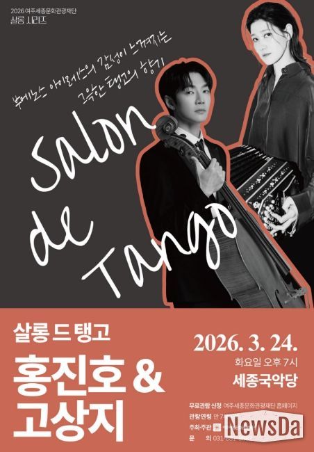뉴스다 최광묵 기자 | 여주세종문화관광재단이 오는 3월 24일, 문화가 있는 날 사업으로 첼로와 반도네온, 피아노가 어우러진 특별한 공연 '살롱 드 탱고 : 홍진호 & 고상지'를 선보인다.