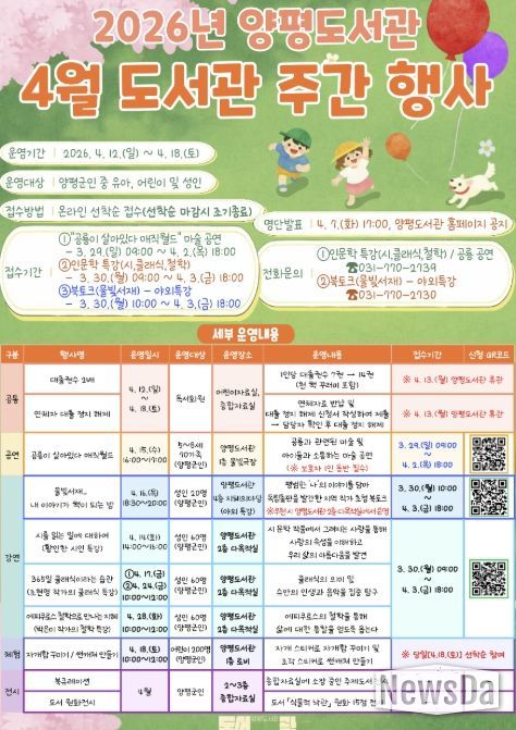 뉴스다 최광묵 기자 | 양평군은 제62회 도서관의 날·도서관 주간(4월 12일~4월 18일)을 맞아 양평도서관에서 어린이부터 성인까지 전 연령층이 참여할 수 있는 공연, 강연, 체험 등 다채로운 행사를 운영한다.