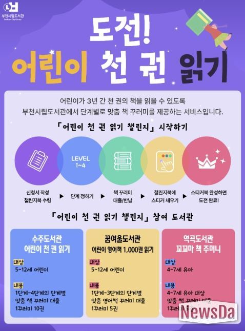 뉴스다 최광묵 기자 | 부천시는 어린이의 체계적인 독서 습관 형성과 도서관 이용 활성화를 위해 기존 수주도서관 중심으로 운영하던 ‘어린이 천 권 읽기 챌린지’를 꿈여울도서관과 역곡도서관까지 확대 운영한다.