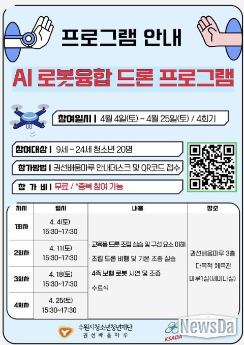 뉴스다 최광묵 기자 | 수원시청소년청년재단 권선배움마루는 오는 4월 청소년을 대상으로 AI 로봇융합 드론 프로그램을 운영할 계획이다. 이번 프로그램은 이론과 실습을 병행한 교육으로 구성되어 미래기술에 대한 이해를 높이고 디지털 역량을 강화하는 데 목적이 있다.