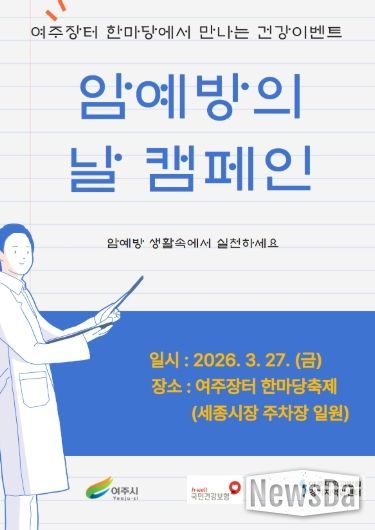 뉴스다 최광묵 기자 | 여주시 건강증진과는 오는 3월 27일, 세종시장 주차장 일원 ‘여주장터 한마당 축제’ 현장에서 시민과 함께하는 암예방의 날 기념 캠페인을 운영한다.