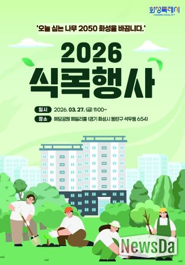 뉴스다 최광묵 기자 | 화성특례시가 제81회 식목일을 기념해 3월 27일 오전 11시 예당공원 동탄패밀리풀에서 ‘2026년 식목행사’를 연다. 이번 행사는 ‘오늘 심는 나무 2050 화성을 바꿉니다’를 주제로 탄소중립 녹색성장 도시 기반을 다지기 위해 마련됐다.