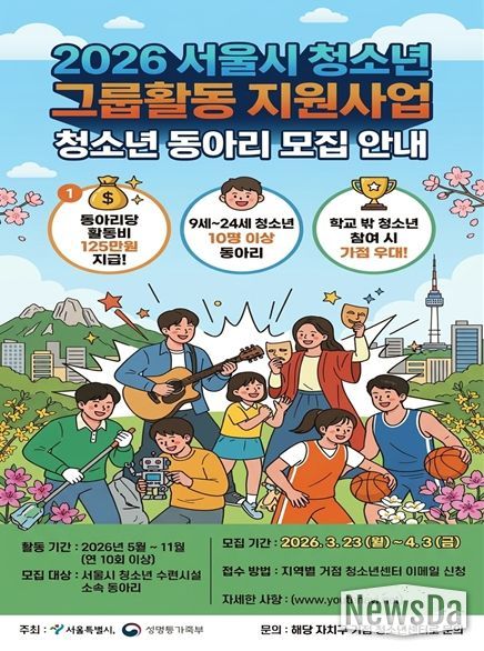 뉴스다 최광묵 기자 | 서울시는 청소년이 스스로 기획하고 운영하는 동아리 활동을 지원하는 '2026년 청소년 그룹활동 지원사업' 참여 동아리 171개를 모집한다고 밝혔다. 청소년의 자율적이고 지속적인 활동 기반을 넓히려는 취지다. 신청은 3월 23일부터 4월 3일까지 자치구별 거점 청소년센터에서 접수한다.