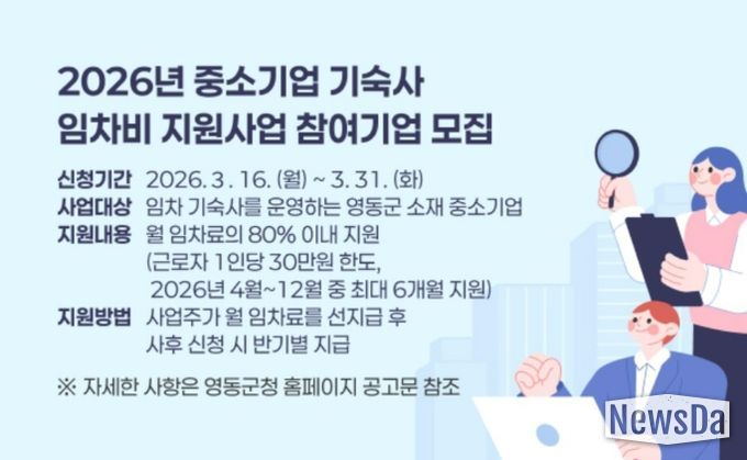 뉴스다 최광묵 기자 | 충북 영동군은 관내 중소기업 근로자의 주거환경 개선과 기업의 인력난 해소를 위해 ‘2026년 중소기업 기숙사 임차비 지원사업’ 참여기업을 오는 31일까지 모집한다고 밝혔다.