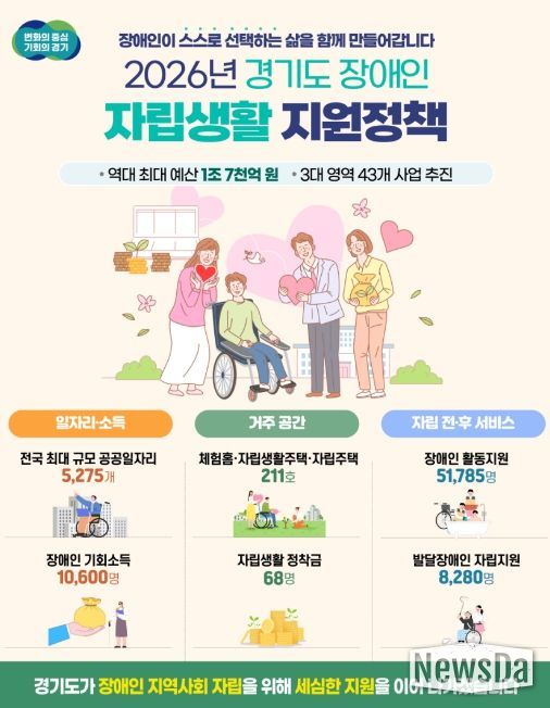 경기도가 장애인이 스스로 삶을 선택하고 주도적으로 살아갈 수 있도록 올해 역대 최대 규모인 1조 7,749억 원의 예산을 투입해 일자리, 거주공간, 자립 전·후 생활지원 등 3대 영역 43개 사업을 추진한다.