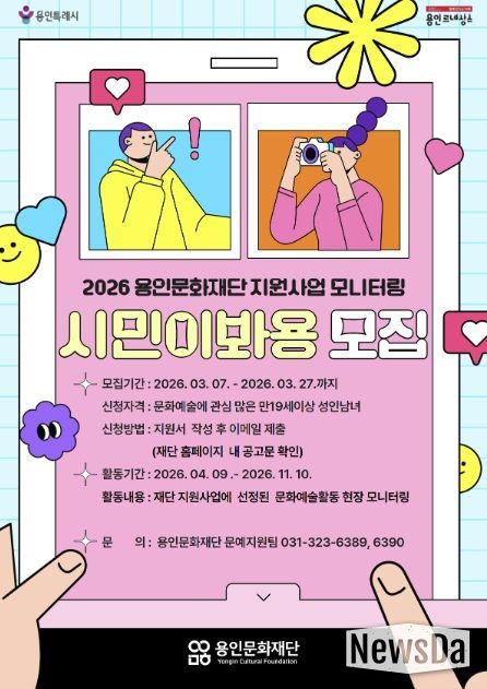 뉴스다 최광묵 기자 | 용인문화재단은 오는 27일까지 용인예술창작지원 선정사업을 시민의 시선에 경험하고 평가하는 “2026 용인문화재단 지원사업 모니터링 '시민이봐용'” 참여자를 모집한다.