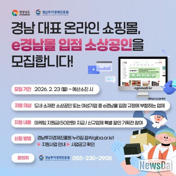 뉴스다 최광묵 기자 | 경상남도는 도내 소상공인의 온라인 진출과 판로 개척을 지원하기 위해 ‘소상공인 온라인 입점 지원사업’을 추진하고 참여를 희망하는 소상공인을 모집한다고 밝혔다.