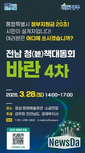 뉴스다 최광묵 기자 | 전라남도는 오는 28일 오후 2시부터 장성 문화예술회관에서 전남 청책대동회 바란을 개최, 전남광주통합특별시 출범과 함께 정부가 약속한 20조 원의 재정 활용 방안을 시도민과 함께 논의할 예정이다.