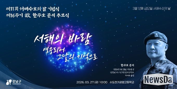 뉴스다 최광묵 기자 | 꿈이 모이는 도시, 미래를 그리는 강남구가 3월 27일 수도전기공업고등학교에서 ‘제11회 서해수호의 날 기념식’과 ‘제16주기 故 한주호 준위 추모식’을 연다. 주민, 학생, 보훈단체, 군 관계자 등 500여 명이 함께할 예정이다.