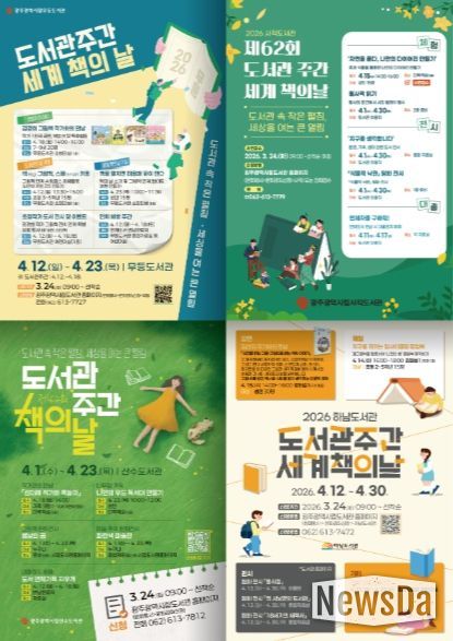 뉴스다 최광묵 기자 | 광주광역시 시립도서관(무등·사직·산수·하남)은 ‘도서관 주간’(4월 12∼18일)과 ‘세계 책의 날’(4월 23일)을 맞아 다양한 독서문화 행사를 마련, 3월 24일부터 참가 신청을 받는다.