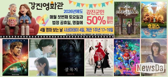 뉴스다 최광묵 기자 | 강진영화관이 군민이 더 쉽게 영화를 즐길 수 있도록 운영하는 ‘영화 보는 날’ 행사로 큰 호응을 얻고 있다. 지난해 4월 17일 문을 연 강진영화관은 개관 1주년을 앞둔 올해 3월 22일 기준 누적 관람객 3만 명을 넘어서며 군민들의 꾸준한 관심 속에 지역 문화공간으로 자리잡고 있다.