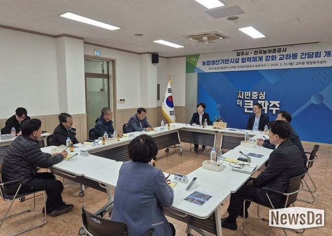뉴스다 최광묵 기자 | 파주시농업기술센터는 지난 23일 교하동 행정복지센터에서 한국농어촌공사 파주지사와 함께 농업생산기반시설의 효율적 관리를 위한 협력 방안을 논의하는 간담회를 개최했다.