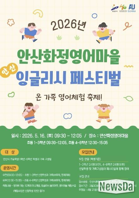 뉴스다 최광묵 기자 | 안산시가 설립하고 안산대학교가 운영하는 안산화정영어마을은 ‘온 가족 영어체험 축제!’를 주제로 ‘안산 잉글리시 페스티벌’을 운영한다고 24일 밝혔다.