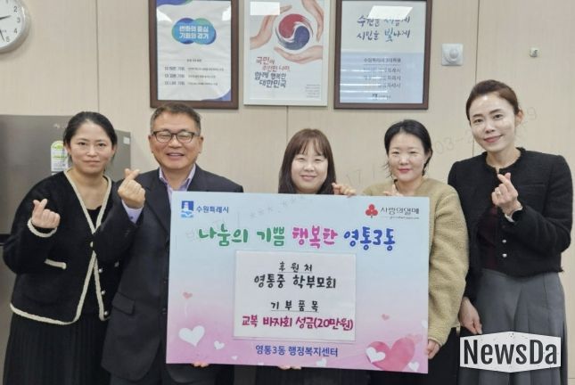 김인태 영통3동장은 “지역사회를 위해 따뜻한 나눔을 실천해주신 영통중 학부모회에 깊이 감사드리며, 전달받은 성금은 도움이 필요한 이웃에게 소중히 전달하겠다”고 감사의 뜻을 밝혔다.
