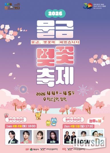뉴스다 최광묵 기자 | 양산시와 양산문화재단이 공동 주최하고 양산문화재단이 주관하는 ‘2026 물금벚꽃축제’가 4월 4일과 5일 이틀간 황산공원 문주광장과 중부광장 일대에서 개최된다.
