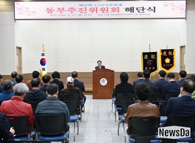 뉴스다 최광묵 기자 | 제65회 3.1민속문화제 동부추진위원회는 지난 23일 남지읍 행정복지센터에서 추진위원과 주민 등 200여 명이 참석한 가운데 해단식을 개최했다고 밝혔다.