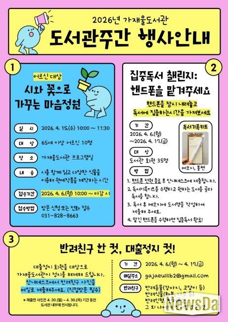 뉴스다 최광묵 기자 | 의정부가재울도서관은 4월 도서관주간을 맞아 시민들이 책과 도서관을 더욱 친숙하게 느낄 수 있도록 프로그램과 이벤트를 운영한다.