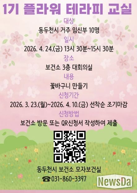 이번 플라워테라피 태교 교실은 4월 24일 보건소 3층 대회의실에서 진행하며 신청 기간은 오는 10일까지로 동두천시 보건소에 등록된 임신부를 선착순 모집한다.