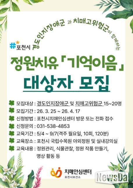 뉴스다 최광묵 기자 | 포천시 치매안심센터는 국립수목원과 함께 경도인지장애군과 치매고위험군을 대상으로 정원 자원을 활용한 정원치유 프로그램 ‘기억이음’ 참여자를 모집한다.