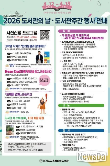 뉴스다 최광묵 기자 | 경기도교육청성남도서관이 2026년 도서관의 날(4월 12일)과 도서관 주간(4월 12일~18일)을 맞아 다양한 독서·문화행사를 운영한다.