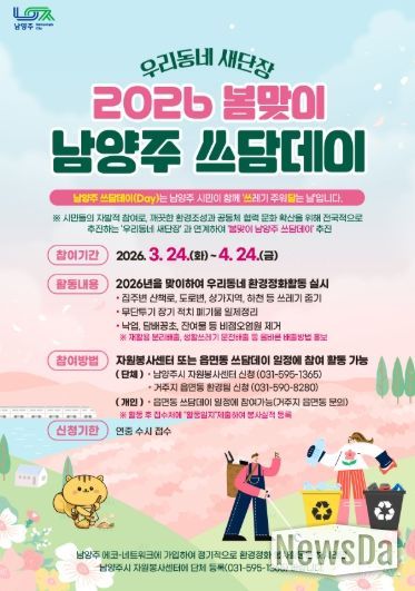 뉴스다 최광묵 기자 | 남양주시는 3월 24일부터 4월 24일까지 시 전역에서‘우리동네 새단장 봄맞이 남양주 쓰담데이’집중 추진기간을 운영한다고 밝혔다.