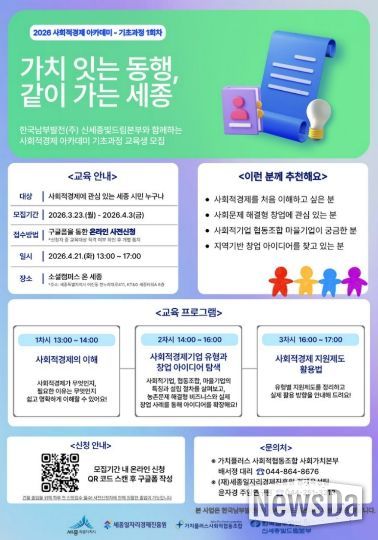 뉴스다 최광묵 기자 | 세종일자리경제진흥원이 한국남부발전㈜ 신세종빛드림본부와 협력해 지역 내 사회적경제 인재를 발굴하고 창업을 지원하기 위한 ‘2026 사회적경제 아카데미’를 운영한다.