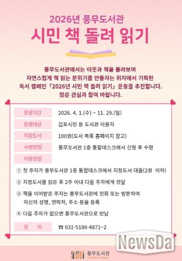 뉴스다 최광묵 기자 | 김포시 풍무도서관은 오는 4월부터 ‘2026년 시민 책 돌려 읽기’ 독서 릴레이를 운영한다.
