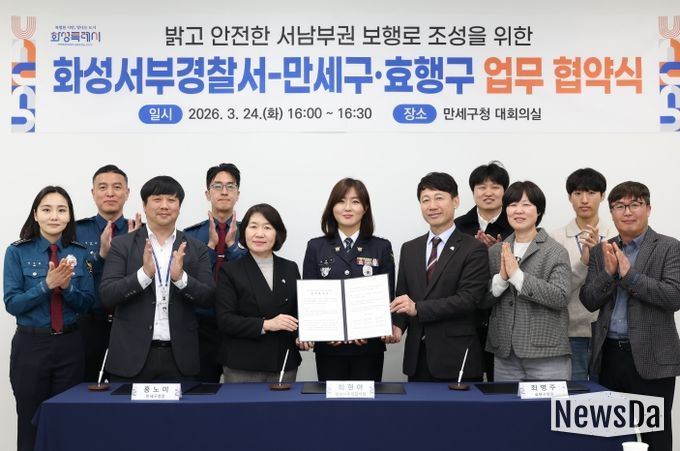 뉴스다 최광묵 기자 | 화성특례시 만세구는 24일 만세구청 대회의실에서 화성서부경찰서, 효행구청과 함께 ‘밝고 안전한 서남부권 보행로 조성을 위한 업무협약(MOU)’을 체결했다고 밝혔다.