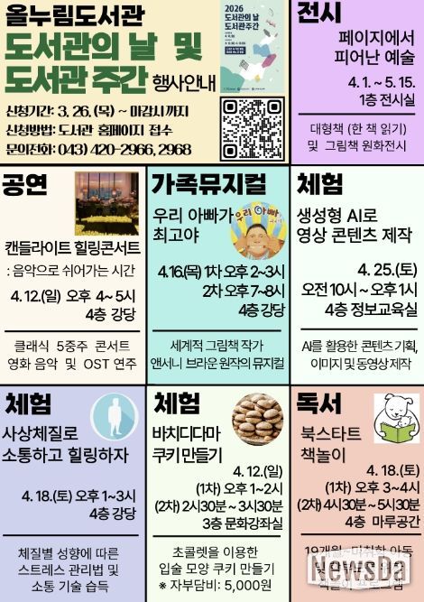 뉴스다 최광묵 기자 | 단양군이 ‘2026 도서관의 날·도서관 주간’을 맞아 다채로운 독서문화 행사를 운영한다.