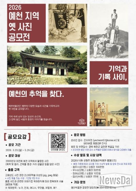 뉴스다 최광묵 기자 | 예천박물관은 지역의 역사와 생활상을 담은 기록을 수집·공유하기 위한 ‘2026 예천 지역 옛 사진 공모전 – 기억과 기록 사이, 예천의 추억을 찾다’ 공모전을 5월 29일까지 개최한다.