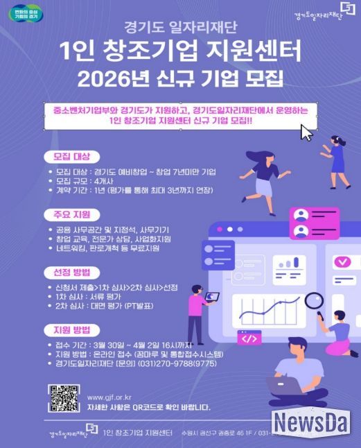 뉴스다 최광묵 기자 | 경기도일자리재단은 창업자와 예비 창업자에게 사무공간과 사업화를 지원하는 ‘1인 창조기업 지원센터’ 참여기업을 30일부터 모집한다.