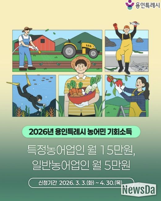 뉴스다 최광묵 기자 | 용인특례시는 4월 30일까지 ‘2026년 농어민 기회소득’ 신청을 받는다고 25일 밝혔다.