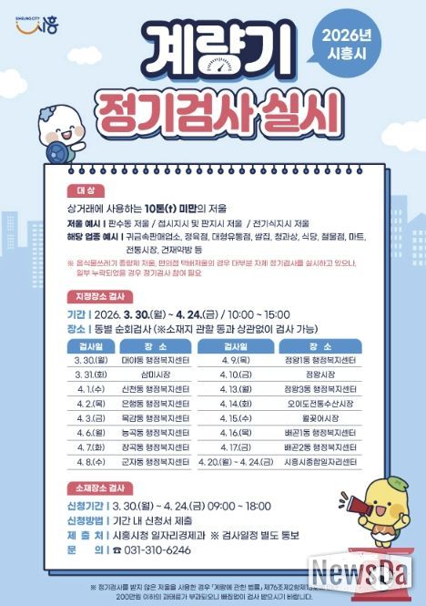 뉴스다 최광묵 기자 | 시흥시는 공정한 상거래 질서 확립과 소비자 권익 보호를 위해 오는 3월 30일부터 4월 24일까지 ‘2026년 계량기(저울) 정기 검사’를 실시한다.