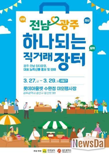 뉴스다 최광묵 기자 | 광주광역시와 전라남도가 27∼29일 사흘간 롯데아울렛 수완점에서 ‘전남·광주 하나되는 직거래장터’를 연다.