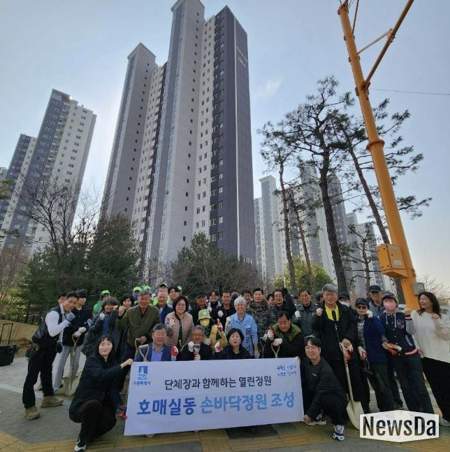 뉴스다 최광묵 기자 | 지난 24일, 수원시 권선구 호매실동은 쾌적한 마을 환경 조성과 도심 속 정원 문화 확산을 위해 아파트 단지 인근 유휴지에 ‘손바닥 정원’을 조성했다.