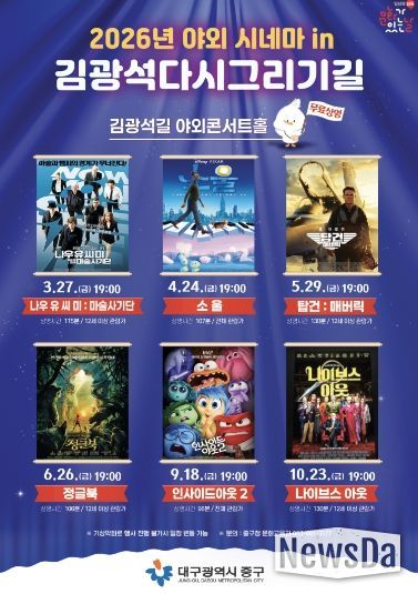 뉴스다 최광묵 기자 | 대구 중구는 오는 3월 27일부터 김광석길 야외콘서트홀에서 2026년 ‘야외 시네마 in 김광석다시그리기길’을 운영한다.