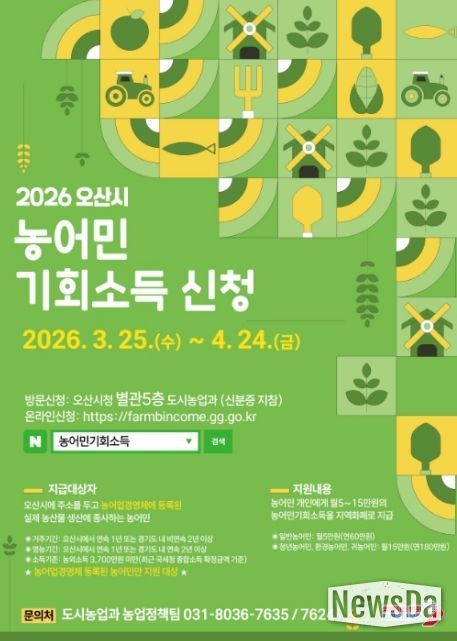 뉴스다 최광묵 기자 | 오산시는 농업·농촌의 공익적 가치 보장과 농어촌 소멸위기 대응을 위해 ‘2026년 농어민 기회소득’ 신청·접수를 3월 25일부터 4월 24일까지 진행한다고 밝혔다.
