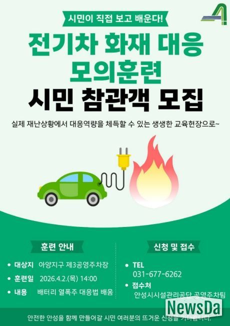 뉴스다 최광묵 기자 | 안성시시설관리공단은 오는 4월 2일 목요일 오후2시 안성시 옥산동 소재 아양지구 제3공영주차장에서 ‘시민과 함께하는 2026년 재난대응 모의훈련’을 실시한다고 밝혔다.