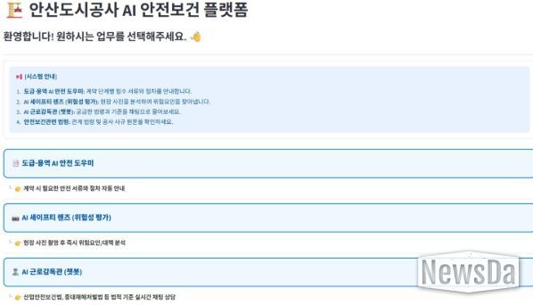 뉴스다 최광묵 기자 | 안산도시공사는 생성형 인공지능(AI) 기술을 접목한 ‘AI 안전보건 플랫폼’을 자체 개발해 현장 사고 예방 업무에 본격적으로 활용한다고 25일 밝혔다.