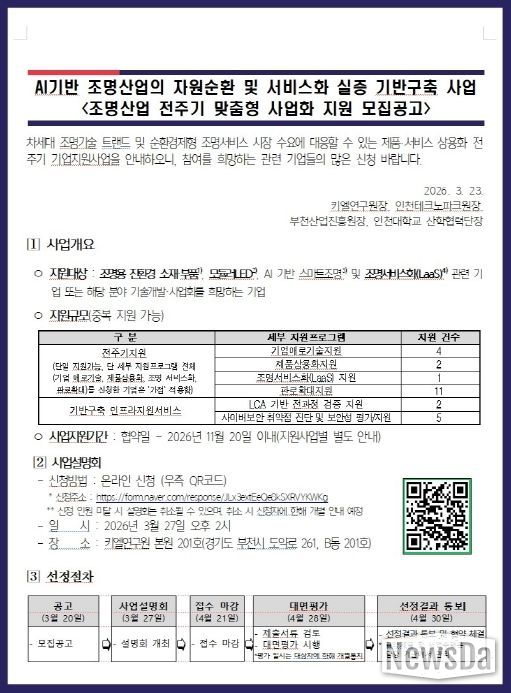 뉴스다 최광묵 기자 | 인천테크노파크(인천TP)는 산업통상부의 ‘AI 기반 조명산업의 자원순환 및 서비스화 실증 기반구축사업’의 일환으로, 조명기업 대상 전주기 사업화 지원 프로그램에 참여할 기업을 오는 4월 21일까지 모집한다고 밝혔다.