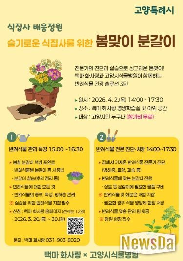 뉴스다 최광묵 기자 | 고양특례시는 시민의 정서·마음 치유를 위한 ‘식집사 배움정원, 반려식물 돌보기 과정’을 오는 4월 2일부터 운영한다.